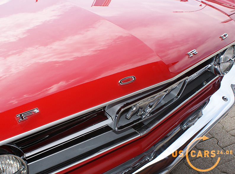 AUSSTATTUNG: C4 Cruise-O-Matic Automatikgetriebe, Bremskraft unterstützte Scheiben-Bremsen vorne, Servo-Lenkung, Elektrisches Cabrio Verdeck, Cabriodach Persenning, Pony Innen-Ausstattung, Pony Türverkleidungen, Leder Ausstattung zweifarbig Rot/Weiß, 5er Armatur, Holz Cockpit und Handschuhfachdeckel, Holz Lenkrad, Sicherheitsgurte vorne mit Pony-Emblem, Fußmatten mit Pony Emblem, Rückfahrscheinwerfer, Getönte Verglasung, Tag/Nacht Innenspiegel, Aussenspiegel auf Fahrer- und Beifahrerseite, Chrom HIPO Luftfilter und Ventildeckel, Chrom Motorölwanne, GT Doppel-Auspuff Anlage mit Trumpet Endstücken, GT Frontgrill mit Nebelscheinwerfern, GT Decor Streifen, GT Embleme, 14 Zoll Styled Steel Wheels mit neuer Weißwandbereifung etc.