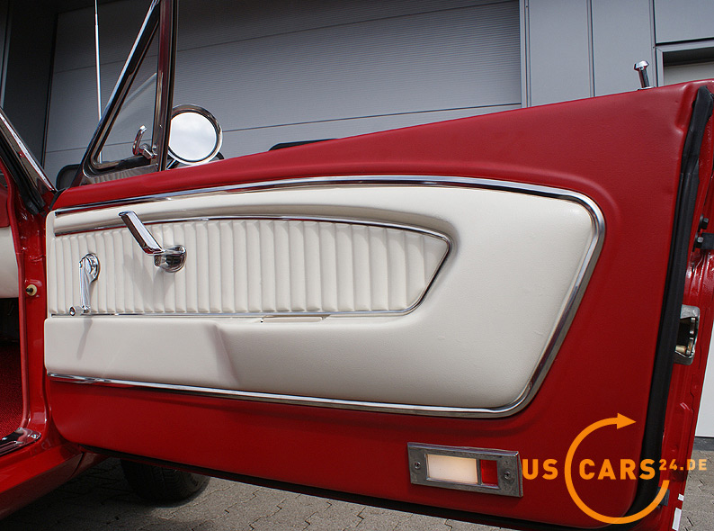 AUSSTATTUNG: C4 Cruise-O-Matic Automatikgetriebe, Bremskraft unterstützte Scheiben-Bremsen vorne, Servo-Lenkung, Elektrisches Cabrio Verdeck, Cabriodach Persenning, Pony Innen-Ausstattung, Pony Türverkleidungen, Leder Ausstattung zweifarbig Rot/Weiß, 5er Armatur, Holz Cockpit und Handschuhfachdeckel, Holz Lenkrad, Sicherheitsgurte vorne mit Pony-Emblem, Fußmatten mit Pony Emblem, Rückfahrscheinwerfer, Getönte Verglasung, Tag/Nacht Innenspiegel, Aussenspiegel auf Fahrer- und Beifahrerseite, Chrom HIPO Luftfilter und Ventildeckel, Chrom Motorölwanne, GT Doppel-Auspuff Anlage mit Trumpet Endstücken, GT Frontgrill mit Nebelscheinwerfern, GT Decor Streifen, GT Embleme, 14 Zoll Styled Steel Wheels mit neuer Weißwandbereifung etc.