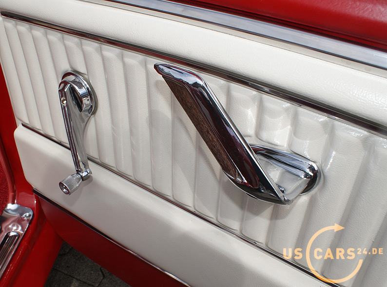 AUSSTATTUNG: C4 Cruise-O-Matic Automatikgetriebe, Bremskraft unterstützte Scheiben-Bremsen vorne, Servo-Lenkung, Elektrisches Cabrio Verdeck, Cabriodach Persenning, Pony Innen-Ausstattung, Pony Türverkleidungen, Leder Ausstattung zweifarbig Rot/Weiß, 5er Armatur, Holz Cockpit und Handschuhfachdeckel, Holz Lenkrad, Sicherheitsgurte vorne mit Pony-Emblem, Fußmatten mit Pony Emblem, Rückfahrscheinwerfer, Getönte Verglasung, Tag/Nacht Innenspiegel, Aussenspiegel auf Fahrer- und Beifahrerseite, Chrom HIPO Luftfilter und Ventildeckel, Chrom Motorölwanne, GT Doppel-Auspuff Anlage mit Trumpet Endstücken, GT Frontgrill mit Nebelscheinwerfern, GT Decor Streifen, GT Embleme, 14 Zoll Styled Steel Wheels mit neuer Weißwandbereifung etc.