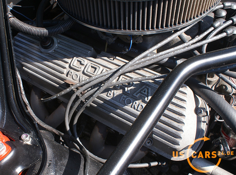 AUSSTATTUNG: C4 Cruise-O-Matic Automatikgetriebe, Zahnstangen-Lenkung manuell, Scheiben-Bremsen vorne, Ford Klima-Anlage, Kopfstützen höhenverstellbar, Mittelkonsole, 5er Armatur, Holzlenkrad, Sicherheitsgurte vorne/hinten, Fußmatten mit Pony Emblem, Stereo Radio/Cassette mit Mustang Schriftzug, Kickpanel Lautsprecher im Fußraum und in der hinteren Verkleidung, Trap Door, Rückfahrscheinwerfer, Chrom Einstiegsleisten, Getönte Verglasung, Tag/Nacht Innenspiegel, Aussenspiegel auf Fahrer- und Beifahrerseite, Alu-Ventildeckel Cobra - Powered by Ford, Aluminium Kühler, K + N Sport-Luftfilter, Stabilisator im Motorraum, Chrom Motorölwanne, GT Doppel-Auspuff Anlage mit Trumpet Endstücken, GT Frontgrill mit Nebelscheinwerfern, GT Tankdeckel, GT Streifen und Embleme, 15 Zoll American Racing Torque Thrust Bullit Felgen inkl. Reserverad etc.