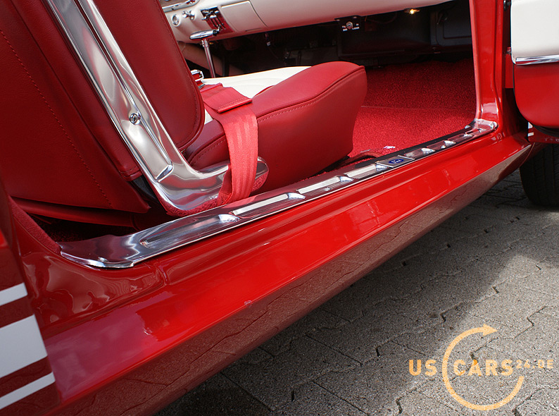 AUSSTATTUNG: C4 Cruise-O-Matic Automatikgetriebe, Bremskraft unterstützte Scheiben-Bremsen vorne, Servo-Lenkung, Elektrisches Cabrio Verdeck, Cabriodach Persenning, Pony Innen-Ausstattung, Pony Türverkleidungen, Leder Ausstattung zweifarbig Rot/Weiß, 5er Armatur, Holz Cockpit und Handschuhfachdeckel, Holz Lenkrad, Sicherheitsgurte vorne mit Pony-Emblem, Fußmatten mit Pony Emblem, Rückfahrscheinwerfer, Getönte Verglasung, Tag/Nacht Innenspiegel, Aussenspiegel auf Fahrer- und Beifahrerseite, Chrom HIPO Luftfilter und Ventildeckel, Chrom Motorölwanne, GT Doppel-Auspuff Anlage mit Trumpet Endstücken, GT Frontgrill mit Nebelscheinwerfern, GT Decor Streifen, GT Embleme, 14 Zoll Styled Steel Wheels mit neuer Weißwandbereifung etc.