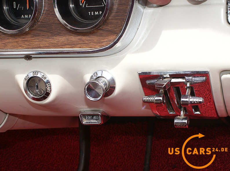 AUSSTATTUNG: C4 Cruise-O-Matic Automatikgetriebe, Bremskraft unterstützte Scheiben-Bremsen vorne, Servo-Lenkung, Elektrisches Cabrio Verdeck, Cabriodach Persenning, Pony Innen-Ausstattung, Pony Türverkleidungen, Leder Ausstattung zweifarbig Rot/Weiß, 5er Armatur, Holz Cockpit und Handschuhfachdeckel, Holz Lenkrad, Sicherheitsgurte vorne mit Pony-Emblem, Fußmatten mit Pony Emblem, Rückfahrscheinwerfer, Getönte Verglasung, Tag/Nacht Innenspiegel, Aussenspiegel auf Fahrer- und Beifahrerseite, Chrom HIPO Luftfilter und Ventildeckel, Chrom Motorölwanne, GT Doppel-Auspuff Anlage mit Trumpet Endstücken, GT Frontgrill mit Nebelscheinwerfern, GT Decor Streifen, GT Embleme, 14 Zoll Styled Steel Wheels mit neuer Weißwandbereifung etc.
