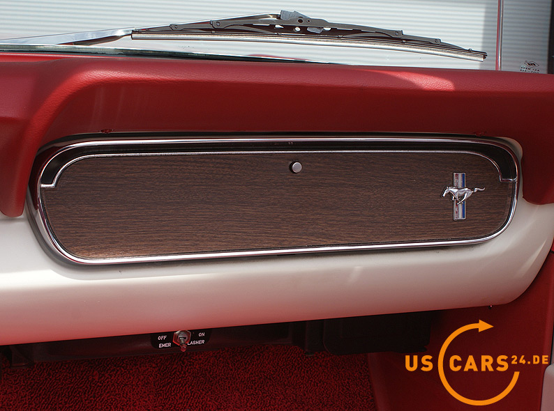 AUSSTATTUNG: C4 Cruise-O-Matic Automatikgetriebe, Bremskraft unterstützte Scheiben-Bremsen vorne, Servo-Lenkung, Elektrisches Cabrio Verdeck, Cabriodach Persenning, Pony Innen-Ausstattung, Pony Türverkleidungen, Leder Ausstattung zweifarbig Rot/Weiß, 5er Armatur, Holz Cockpit und Handschuhfachdeckel, Holz Lenkrad, Sicherheitsgurte vorne mit Pony-Emblem, Fußmatten mit Pony Emblem, Rückfahrscheinwerfer, Getönte Verglasung, Tag/Nacht Innenspiegel, Aussenspiegel auf Fahrer- und Beifahrerseite, Chrom HIPO Luftfilter und Ventildeckel, Chrom Motorölwanne, GT Doppel-Auspuff Anlage mit Trumpet Endstücken, GT Frontgrill mit Nebelscheinwerfern, GT Decor Streifen, GT Embleme, 14 Zoll Styled Steel Wheels mit neuer Weißwandbereifung etc.