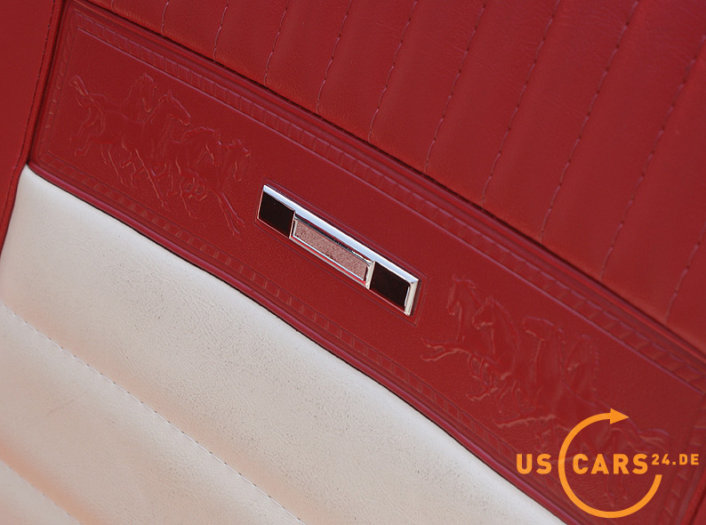 AUSSTATTUNG: C4 Cruise-O-Matic Automatikgetriebe, Bremskraft unterstützte Scheiben-Bremsen vorne, Servo-Lenkung, Elektrisches Cabrio Verdeck, Cabriodach Persenning, Pony Innen-Ausstattung, Pony Türverkleidungen, Leder Ausstattung zweifarbig Rot/Weiß, 5er Armatur, Holz Cockpit und Handschuhfachdeckel, Holz Lenkrad, Sicherheitsgurte vorne mit Pony-Emblem, Fußmatten mit Pony Emblem, Rückfahrscheinwerfer, Getönte Verglasung, Tag/Nacht Innenspiegel, Aussenspiegel auf Fahrer- und Beifahrerseite, Chrom HIPO Luftfilter und Ventildeckel, Chrom Motorölwanne, GT Doppel-Auspuff Anlage mit Trumpet Endstücken, GT Frontgrill mit Nebelscheinwerfern, GT Decor Streifen, GT Embleme, 14 Zoll Styled Steel Wheels mit neuer Weißwandbereifung etc.