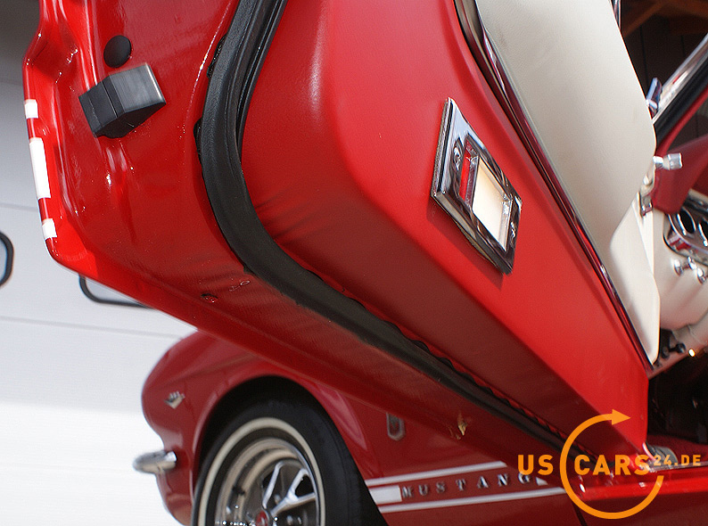 AUSSTATTUNG: C4 Cruise-O-Matic Automatikgetriebe, Bremskraft unterstützte Scheiben-Bremsen vorne, Servo-Lenkung, Elektrisches Cabrio Verdeck, Cabriodach Persenning, Pony Innen-Ausstattung, Pony Türverkleidungen, Leder Ausstattung zweifarbig Rot/Weiß, 5er Armatur, Holz Cockpit und Handschuhfachdeckel, Holz Lenkrad, Sicherheitsgurte vorne mit Pony-Emblem, Fußmatten mit Pony Emblem, Rückfahrscheinwerfer, Getönte Verglasung, Tag/Nacht Innenspiegel, Aussenspiegel auf Fahrer- und Beifahrerseite, Chrom HIPO Luftfilter und Ventildeckel, Chrom Motorölwanne, GT Doppel-Auspuff Anlage mit Trumpet Endstücken, GT Frontgrill mit Nebelscheinwerfern, GT Decor Streifen, GT Embleme, 14 Zoll Styled Steel Wheels mit neuer Weißwandbereifung etc.