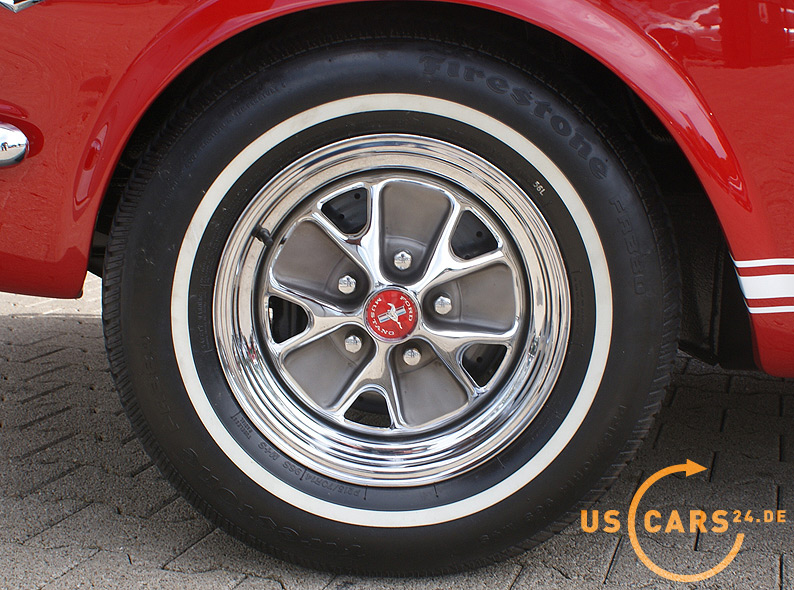 AUSSTATTUNG: C4 Cruise-O-Matic Automatikgetriebe, Bremskraft unterstützte Scheiben-Bremsen vorne, Servo-Lenkung, Elektrisches Cabrio Verdeck, Cabriodach Persenning, Pony Innen-Ausstattung, Pony Türverkleidungen, Leder Ausstattung zweifarbig Rot/Weiß, 5er Armatur, Holz Cockpit und Handschuhfachdeckel, Holz Lenkrad, Sicherheitsgurte vorne mit Pony-Emblem, Fußmatten mit Pony Emblem, Rückfahrscheinwerfer, Getönte Verglasung, Tag/Nacht Innenspiegel, Aussenspiegel auf Fahrer- und Beifahrerseite, Chrom HIPO Luftfilter und Ventildeckel, Chrom Motorölwanne, GT Doppel-Auspuff Anlage mit Trumpet Endstücken, GT Frontgrill mit Nebelscheinwerfern, GT Decor Streifen, GT Embleme, 14 Zoll Styled Steel Wheels mit neuer Weißwandbereifung etc.