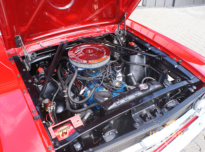 AUSSTATTUNG: C4 Cruise-O-Matic Automatikgetriebe, Bremskraft unterstützte Scheiben-Bremsen vorne, Servo-Lenkung, Elektrisches Cabrio Verdeck, Cabriodach Persenning, Pony Innen-Ausstattung, Pony Türverkleidungen, Leder Ausstattung zweifarbig Rot/Weiß, 5er Armatur, Holz Cockpit und Handschuhfachdeckel, Holz Lenkrad, Sicherheitsgurte vorne mit Pony-Emblem, Fußmatten mit Pony Emblem, Rückfahrscheinwerfer, Getönte Verglasung, Tag/Nacht Innenspiegel, Aussenspiegel auf Fahrer- und Beifahrerseite, Chrom HIPO Luftfilter und Ventildeckel, Chrom Motorölwanne, GT Doppel-Auspuff Anlage mit Trumpet Endstücken, GT Frontgrill mit Nebelscheinwerfern, GT Decor Streifen, GT Embleme, 14 Zoll Styled Steel Wheels mit neuer Weißwandbereifung etc.