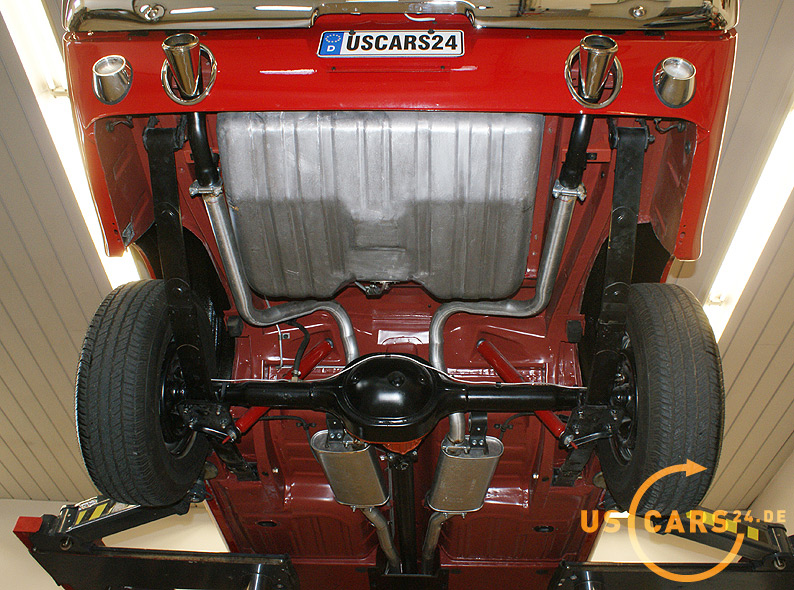 AUSSTATTUNG: C4 Cruise-O-Matic Automatikgetriebe, Bremskraft unterstützte Scheiben-Bremsen vorne, Servo-Lenkung, Elektrisches Cabrio Verdeck, Cabriodach Persenning, Pony Innen-Ausstattung, Pony Türverkleidungen, Leder Ausstattung zweifarbig Rot/Weiß, 5er Armatur, Holz Cockpit und Handschuhfachdeckel, Holz Lenkrad, Sicherheitsgurte vorne mit Pony-Emblem, Fußmatten mit Pony Emblem, Rückfahrscheinwerfer, Getönte Verglasung, Tag/Nacht Innenspiegel, Aussenspiegel auf Fahrer- und Beifahrerseite, Chrom HIPO Luftfilter und Ventildeckel, Chrom Motorölwanne, GT Doppel-Auspuff Anlage mit Trumpet Endstücken, GT Frontgrill mit Nebelscheinwerfern, GT Decor Streifen, GT Embleme, 14 Zoll Styled Steel Wheels mit neuer Weißwandbereifung etc.