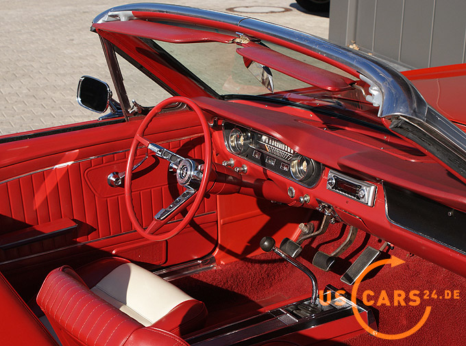 289er 4.7L V8 Motor mit 4-Gang Schaltgetriebe, GT Styled Steel Wheels mit neuer Weisswand Bereifung, Elektrisches Cabrio Verdeck, Cabrio Persenning weiss, Original Mittelkonsole, Neue Pony Leder Innen-Ausstattung in zweifarbig Rot-Weiss, Sicherheitsgurte vorne und hinten, Aussenspiegel auf Fahrer- und Beifahrerseite, Gepäckträger auf Heckklappe, Chrom Luftfilter etc.