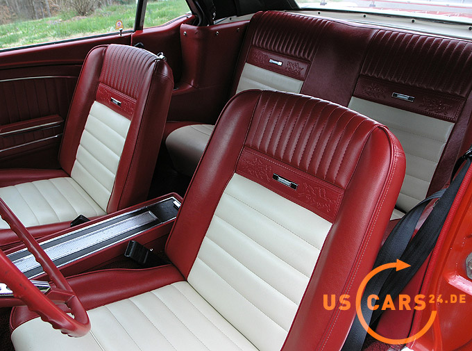 289er 4.7L V8 Motor mit 4-Gang Schaltgetriebe, GT Styled Steel Wheels mit neuer Weisswand Bereifung, Elektrisches Cabrio Verdeck, Cabrio Persenning weiss, Original Mittelkonsole, Neue Pony Leder Innen-Ausstattung in zweifarbig Rot-Weiss, Sicherheitsgurte vorne und hinten, Aussenspiegel auf Fahrer- und Beifahrerseite, Gepäckträger auf Heckklappe, Chrom Luftfilter etc.