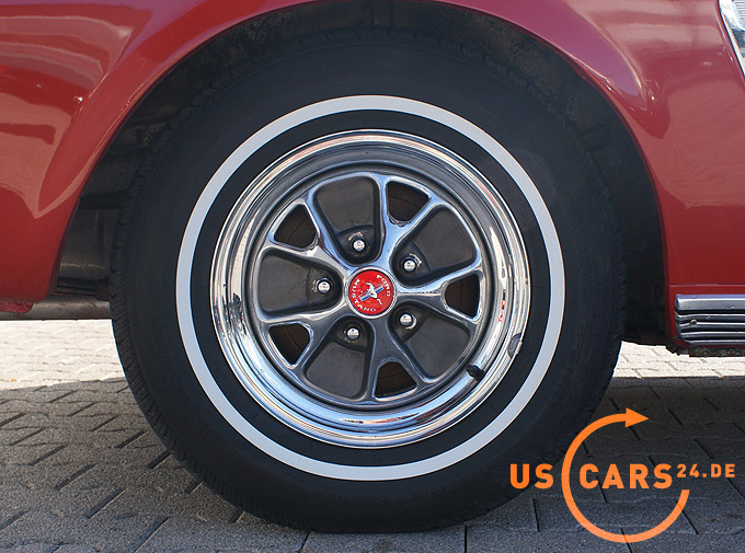 289er 4.7L V8 Motor mit 4-Gang Schaltgetriebe, GT Styled Steel Wheels mit neuer Weisswand Bereifung, Elektrisches Cabrio Verdeck, Cabrio Persenning weiss, Original Mittelkonsole, Neue Pony Leder Innen-Ausstattung in zweifarbig Rot-Weiss, Sicherheitsgurte vorne und hinten, Aussenspiegel auf Fahrer- und Beifahrerseite, Gepäckträger auf Heckklappe, Chrom Luftfilter etc.