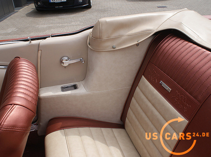 AUSSTATTUNG: C4 Automatikgetriebe, Bremskraft unterstützte Scheiben-Bremsen vorne, Servo unterstützte Lenkung, Elektrisches Cabrio Verdeck, Klimaanlage, 5er Armatur, Holz Cockpit und Handschuhfachdeckel, Holz Lenkrad, Volle Mittelkonsole mit Chrom Applikationen, Weisswand Bereifung, Cabriodach Persenning, Rückfahrscheinwerfer, Chrom HIPO Luftfilter, Mustang Performance Ventildeckel, Chrom Motorölwanne, Chrom Getriebeölwanne, Pony Innen-Ausstattung zweifarbig Emberglow-Beige, Sicherheitsgurte vorne, Von innen verstellbarer Außenspiegel - Fahrerseite, Tag/Nacht Innenspiegel, Leder Innen-Ausstattung, Alu Einstiegsleisten