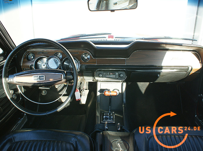 351er Windsor 5.8L V8 Motor mit C6 Automatikgetriebe, Kompletter Shelby GT350 Umbau - Shelby Front, Shelby Motorhaube mit Twist Lock, Shelby Heck mit Spoiler, Shelby Rückleuchten, Shelby Tankverschluss, Shelby Embleme, Shelby Rally Streifen over the top und an den Einstiegen, Shelby Side Scoops, Shelby Window Scoops, Cobra Lenkrad - Konsolendeckel und Schaltknauf, Sicherheitsgurte mit Shelby Emblem, Gurthalter in der Mittelkonsole, 15 Zoll Shelby Alufelgen mit neuer Goodyaer Eagle II Bereifung in der Größe 235/60 R15, Cobra Luftfilter, Doppel-Auspuff, Servo Lenkung, bremskraftunterstützte Bremsen vorne, Nebelscheinwerfer, Leder-Ausstattung, Innenraum mit Holzakzenten und Cobra Jet Emblem, Umlegbare Rücksitzbank, Cockpit mit 5 Armaturen, Drehzahlmesser Zusatzarmatur von Sun Super auf der Lenksäule, Zusatzarmaturen von Sunpro in der Mittelkonsole für Öldruck und Motortemperatur, Volle Mittelkonsole etc.