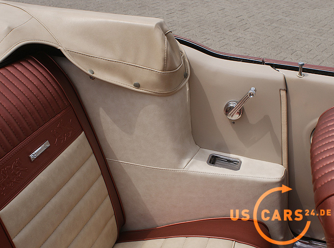 AUSSTATTUNG: C4 Automatikgetriebe, Bremskraft unterstützte Scheiben-Bremsen vorne, Servo unterstützte Lenkung, Elektrisches Cabrio Verdeck, Klimaanlage, 5er Armatur, Holz Cockpit und Handschuhfachdeckel, Holz Lenkrad, Volle Mittelkonsole mit Chrom Applikationen, Weisswand Bereifung, Cabriodach Persenning, Rückfahrscheinwerfer, Chrom HIPO Luftfilter, Mustang Performance Ventildeckel, Chrom Motorölwanne, Chrom Getriebeölwanne, Pony Innen-Ausstattung zweifarbig Emberglow-Beige, Sicherheitsgurte vorne, Von innen verstellbarer Außenspiegel - Fahrerseite, Tag/Nacht Innenspiegel, Leder Innen-Ausstattung, Alu Einstiegsleisten